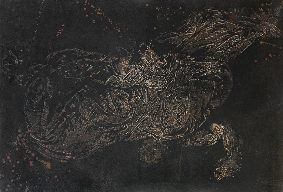 L'envahissement de la couleur dans ces peintures souvent monochromes et les visions fantomatiques généréres par les empreintes forment un univers onirique, qui nous ramène vers un monde originel, départ d'un songe éveillé. Au détour d'un pli, on croit reconnaître un visage, un corps, une forme animale amicale ou menaçante selon son propre imaginaire...